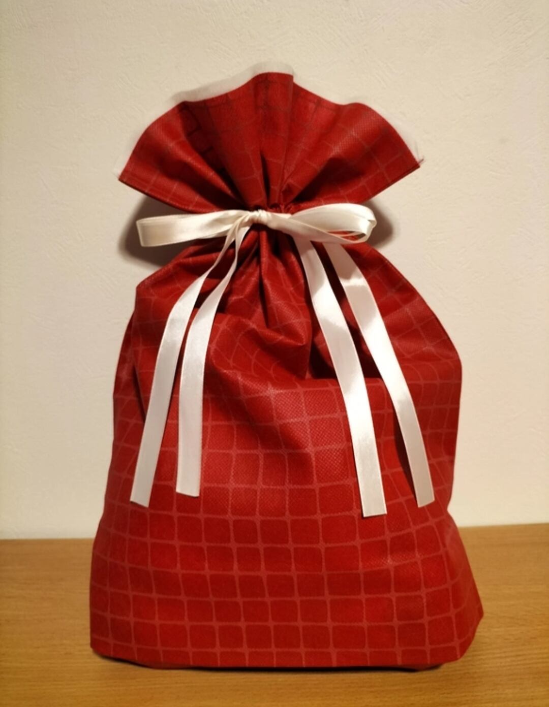 赤のリボン付き袋にお入れします。