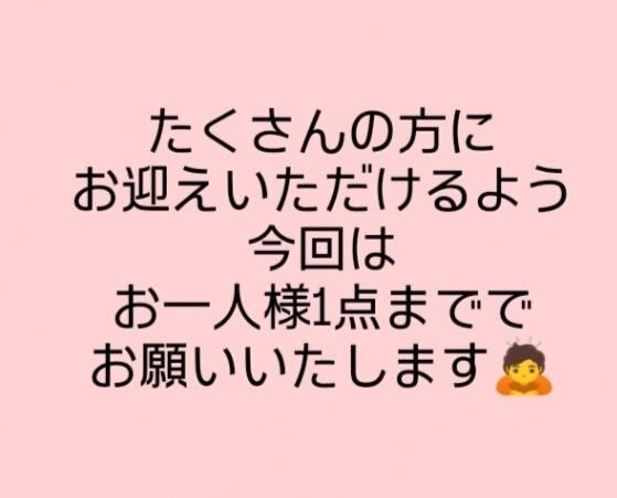 今回は各種一つずつのみとなっておりますので、お一人様1点まででお願いいたします。